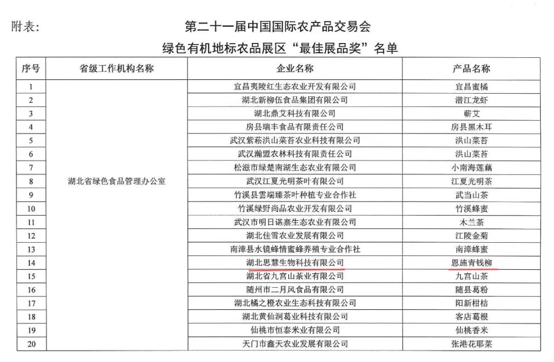 岁末获喜讯,佳绩贺新年!12月16日,中国绿色食品发展中心发来贺函,由湖北思慧生物科技有限公司选送的国家农产品地理标志产品--“恩施青钱柳”凭借其卓越的高品质在第21届中国国际农产品交易会(以下简称农交会)上首次设立的“绿色有机地标农品展区”中获得“最佳展品奖”,荣誉榜上再添新绩。